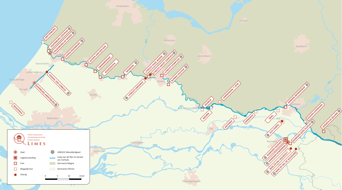 Het Werelderfgoed de Neder-Germaanse Limes telt in Nederland 19 archeologische vindplaatsen, verspreid over 12 gemeenten in de provincies Gelderland, Utrecht en Zuid-Holland. Op sommige plaatsen zijn de archeologische monumenten zichtbaar gemaakt door moderne visualisaties, zoals bijvoorbeeld bij Park Matilo bij Leiden, Fort Vechten in Utrecht, of Castellum Meinerswijk bij Arnhem. Op andere plaatsen kun je de daadwerkelijke resten bewonderen, zoals onder de Grote Kerk in Elst. En op weer andere plaatsen blijven de resten veilig opgeborgen onder de grond. Samen met de rivier de Rijn vormen deze archeologische overblijfselen een monumentale grens van vroeger én nu.